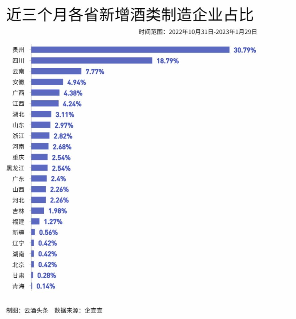 在近三月内新增的708家酒类企业中,位于贵州、四川两省新增酒类制造企业数量分别为218家、133家,共计351家,占全国新增注册酒企总数近一半。