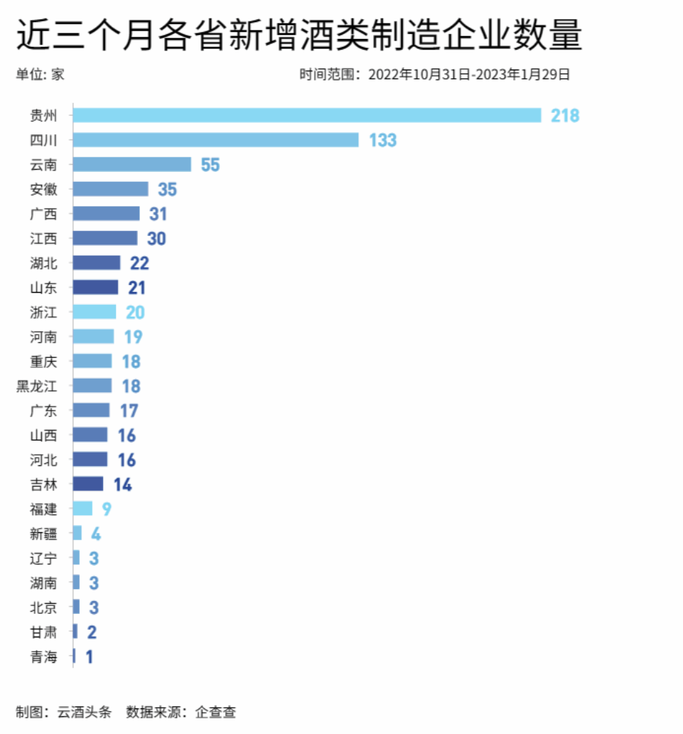 数据显示,过去三个月内,云南(55)、安徽(34)、广西(31)、江西(30)、湖北(22)、山东(21)、浙江(20)、河南(19)、重庆(19)、黑龙江(18)等省份位居新增企业数量前十,福建、新疆、辽宁、湖南、北京、甘肃、青海等地区也均分布有新注册的酒类制造企业。