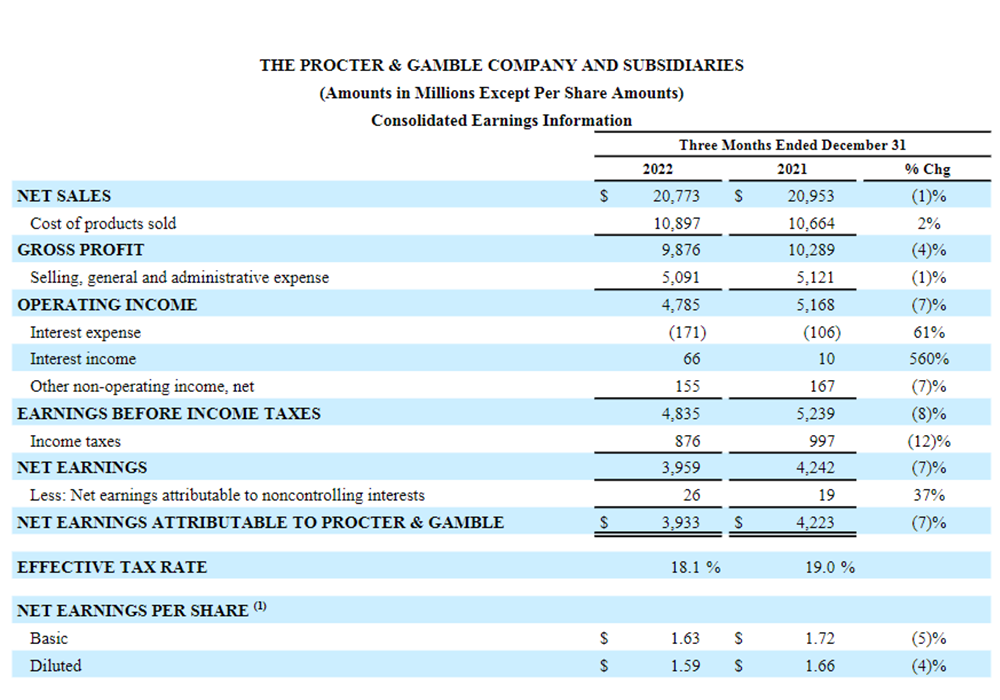 1月19日,宝洁公布2023财年第二季度(2022年10月1日-2022年12月31日)财报。财报显示,第二季度净销售额为208亿美元(约合人民币1404亿元),同比下降1%;净利润为39.6亿美元(约合人民币267.4亿元),同比下降7%。除去外汇、收购和资产剥离的影响,有机销售额增长了5%。
