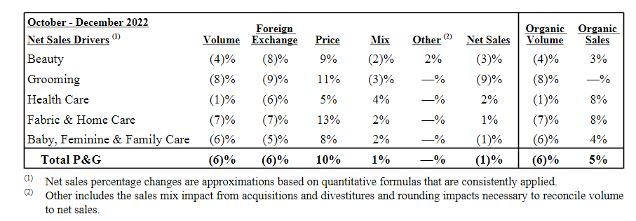 2023财年第二季度,宝洁各大业务版块综合提价10%,但销量录得6%的负增长,净销售额同比下降1%。宝洁提到,不利的外汇对净销售额产生了6%的影响,该数据与宝洁在本财年第一季度的预测相符合。