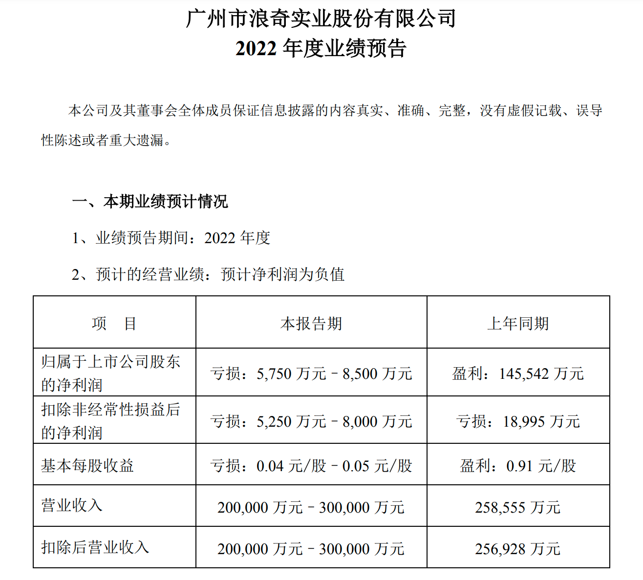 1月30日,广州浪奇(000523)发布2022年年度业绩预告,公司预计营业收入为20亿至30亿元,归属于上市公司股东的净利润为-8500万至-5750万,净利润同比下降105.84%至103.95%。