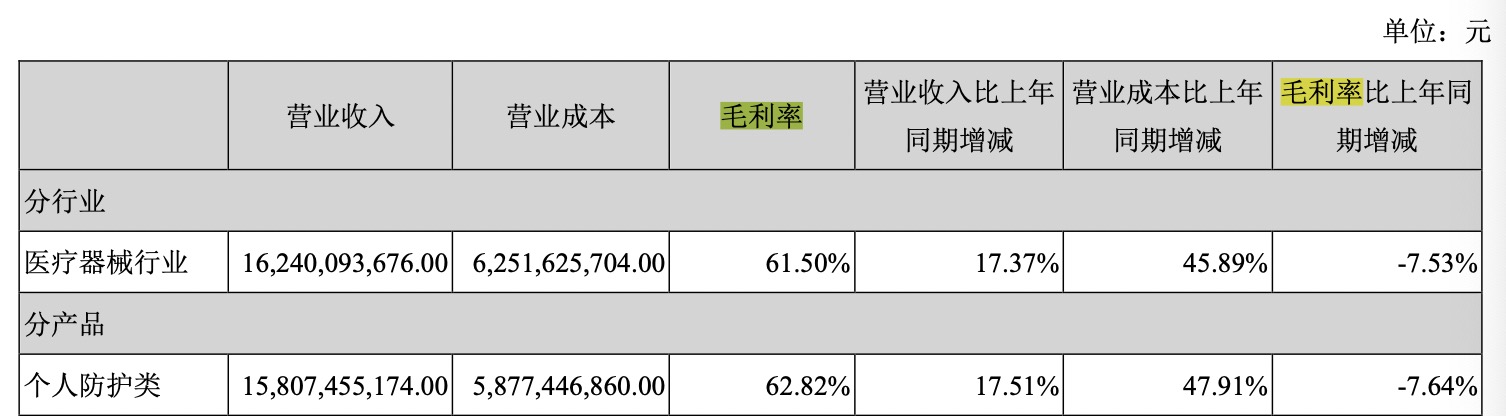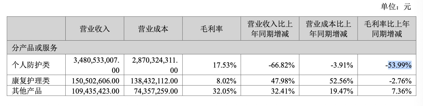 据2022年半年报,英科医疗个人防护类收入34.81亿元,同比下降66.82%;毛利率为17.53%,同比下降53.99%。