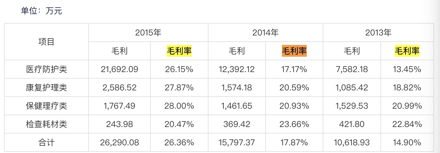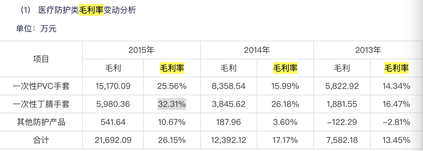 招股书显示,2015年,英科医疗PVC手套均价为93.61元/千支;丁腈手套均价为163.97元/千支。粗略估算,PVC手套和丁腈手套共均价为128.79元/千支。2013年、2014年、2015年医疗防护类毛利率分别为13.45%、17.17%与26.15%。其中,一次性PVC手套毛利率分别为14.34%、15.99%与25.56%;一次性丁腈手套毛利率分别为16.47%、26.18%与32.31%。