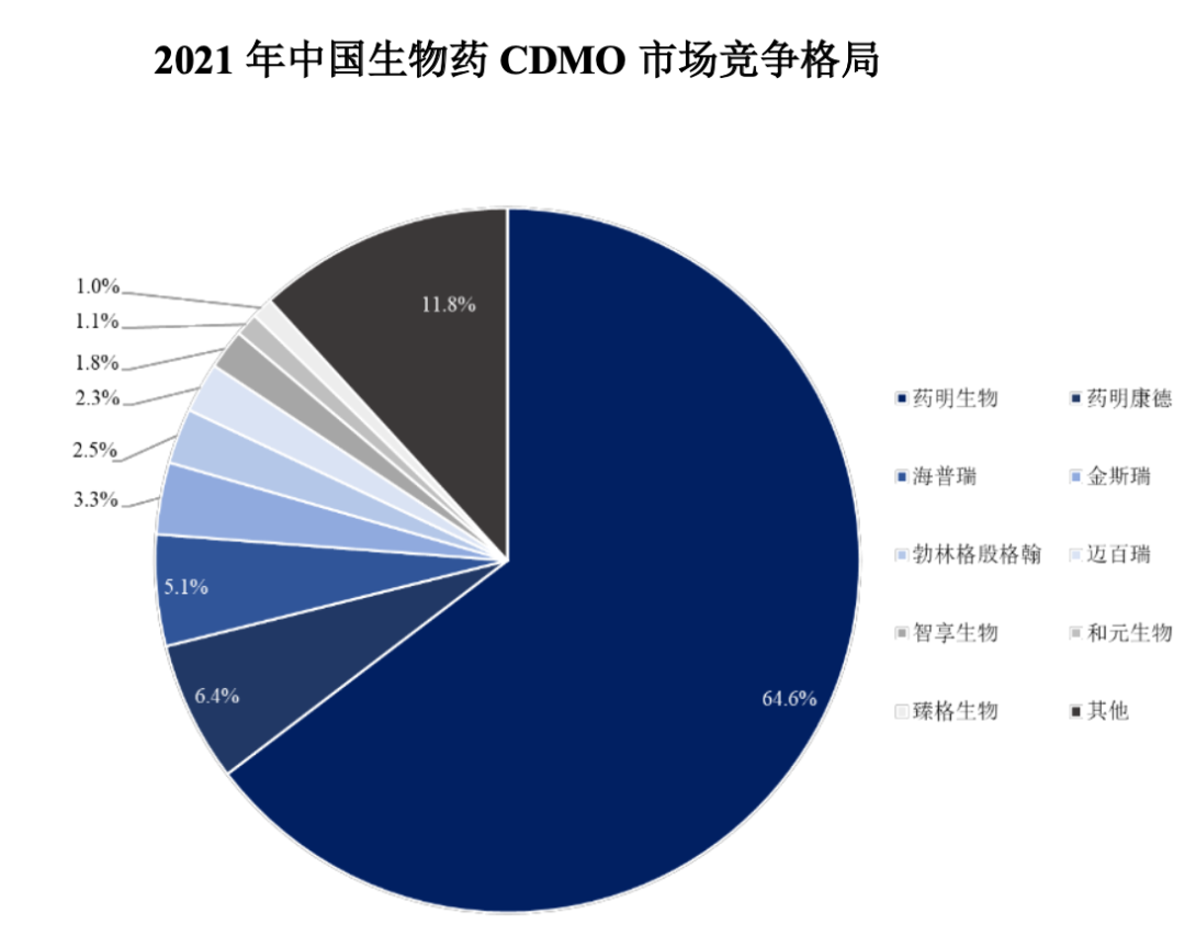 根据“弗若斯特沙利文报告”,药明生物(2269.HK)、药明康德(603259.SH)和海普瑞(002399.SZ)占据2021年中国生物药CDMO市场份额的前三位,占比分别为64.6%、6.4%、5.1%,三家合计市场占有率超71%。
