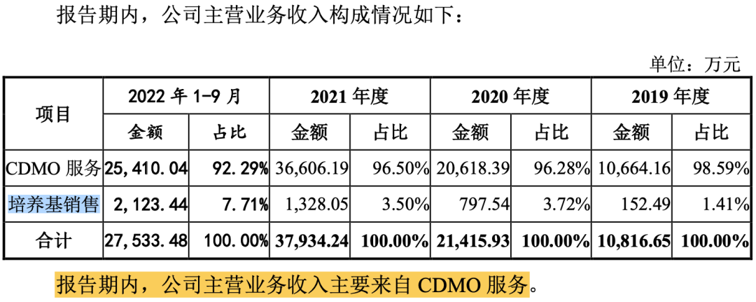 2019年-2021年以及2022年1-9月(下称“报告期”),迈百瑞CDMO服务的营收占比分别是98.59%、96.28%、96.5%、92.29%。此外的收入构成均来自培养基销售。