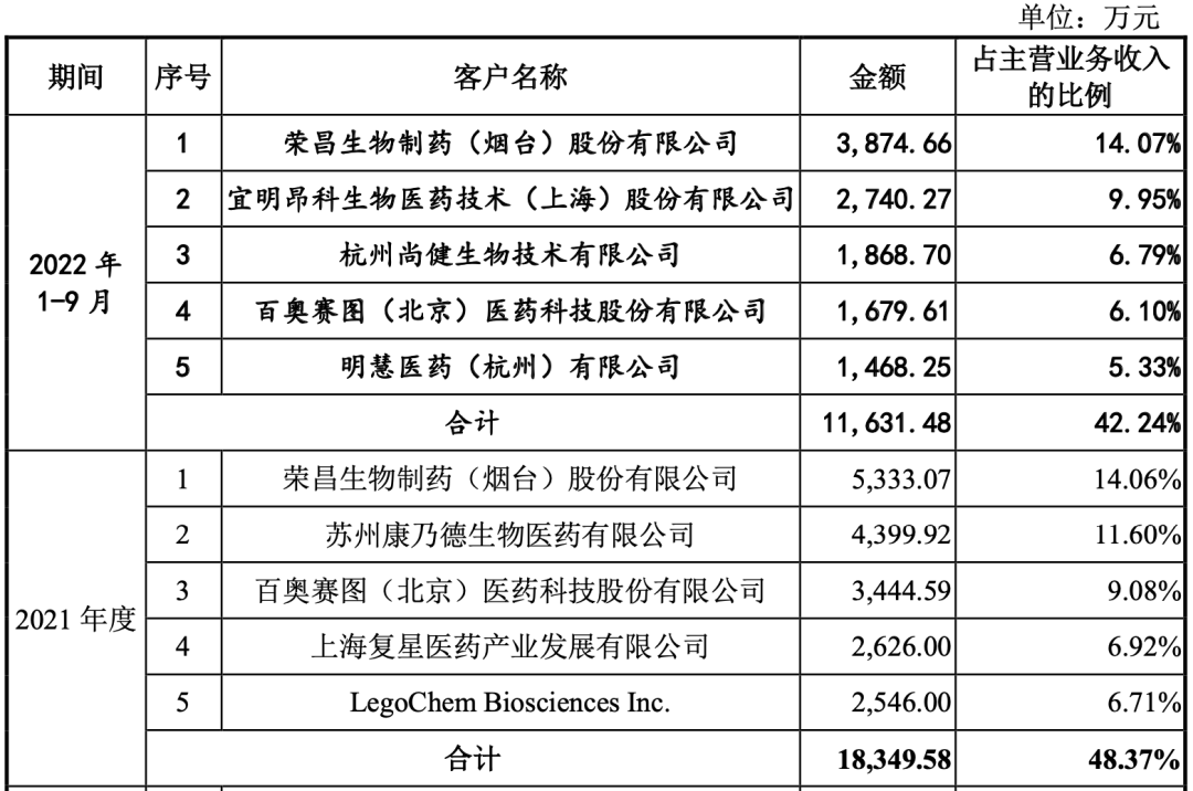 在2021年和2022年1-9月,荣昌生物都是迈百瑞的第一大客户,销售占比14%以上。