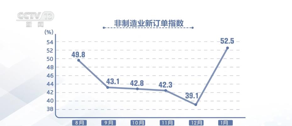 央视网消息:非制造业主要包括服务业、建筑业。从主要分项指数来看,非制造业的商务活动指数和新订单指数,在1月份双双重回50%以上的扩张区间,并且环比升幅均超过10个百分点。非制造业供需加速回升,回稳向好发展态势显现。