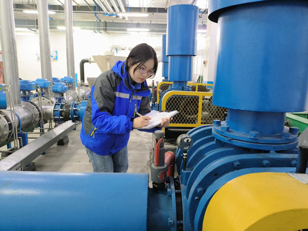 武汉大东湖深隧项目预处理站站长韩霜在检修设备。(受访者供图)