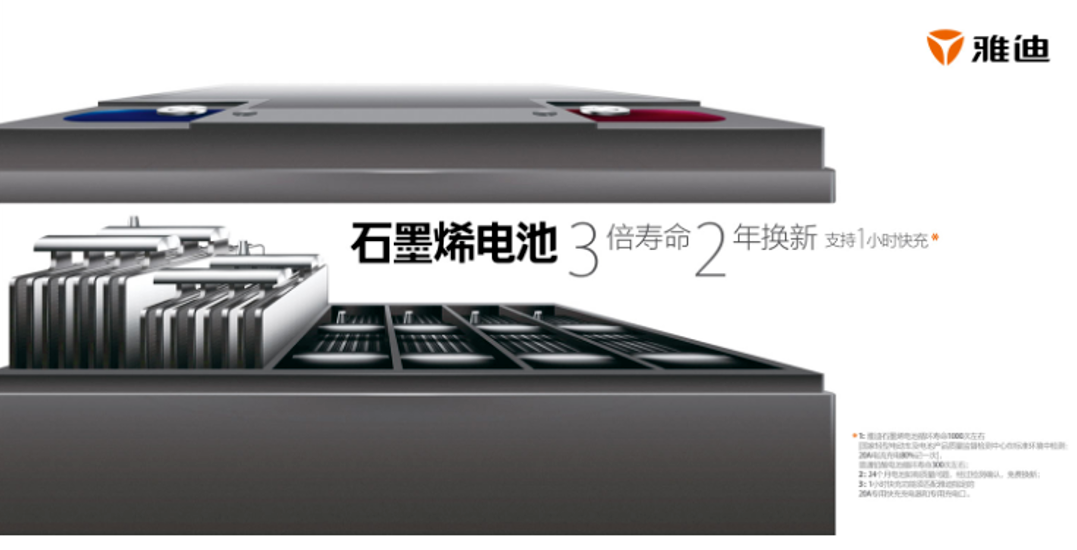 为了拔高身段,雅迪铺天盖地地宣传自研的石墨烯技术,综合官网的介绍:石墨烯具有优异的光学、电学、力学特性,被认为是一种未来革命性的材料。若将它添加在铅酸电池上,会大大提升电池的寿命、动力、里程和耐低温性。