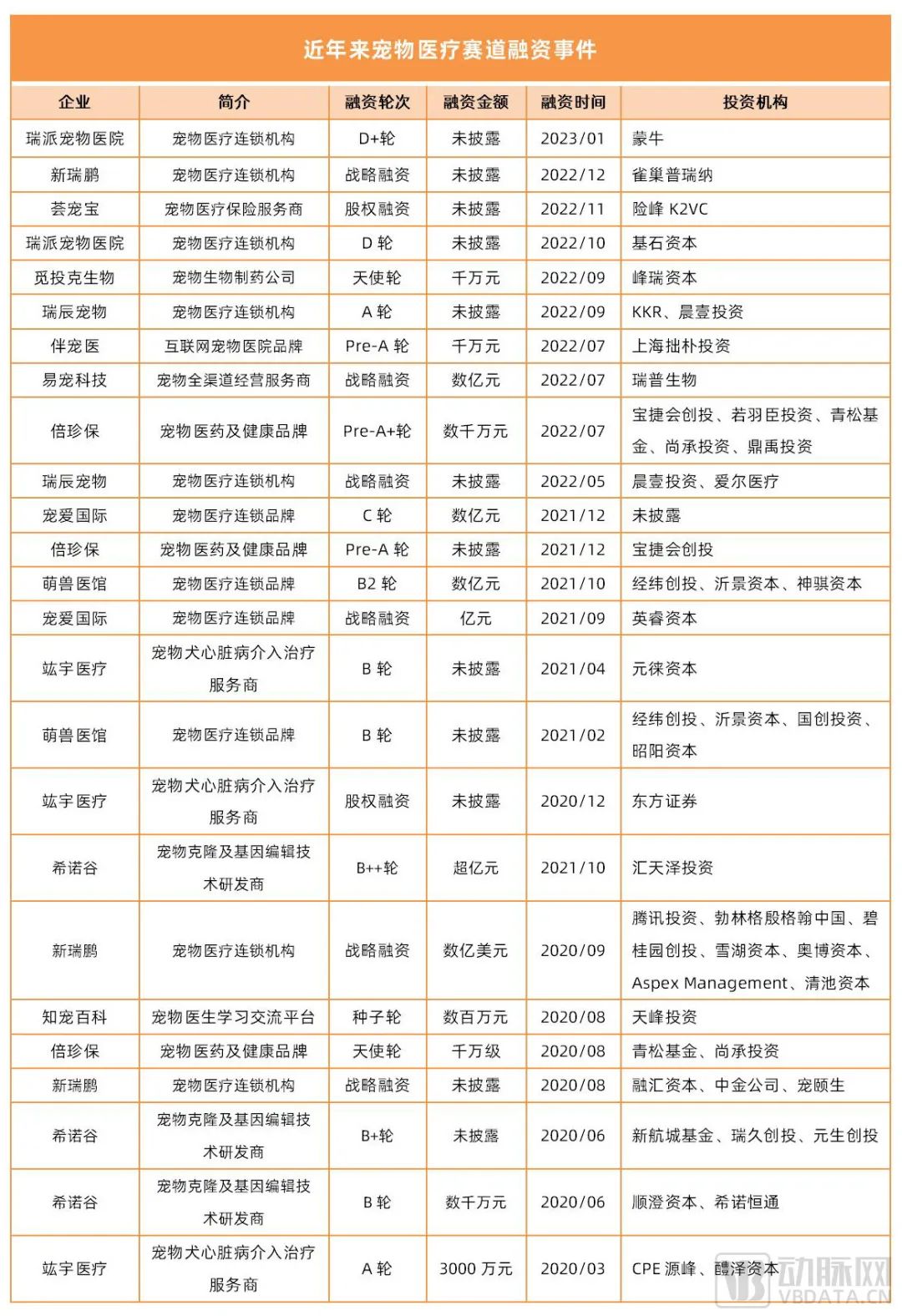 “宠物赛道是一个典型的被资本‘点燃’的领域,海量资金的涌入让行业加速发展了五六年。”一位此前参与了多家宠物医疗企业尽调的机构VP李凌霖(化名)告诉动脉网,2017年前后,以新瑞鹏为代表的企业吸引了众多VC/PE,随后由点及面,宠物医疗赛道大面积开花,从医疗服务机构、新疗法、医疗保险到宠物医生教育,各个细分领域涌现了众多创新企业,一些企业融到了上千万甚至数亿元的资金。