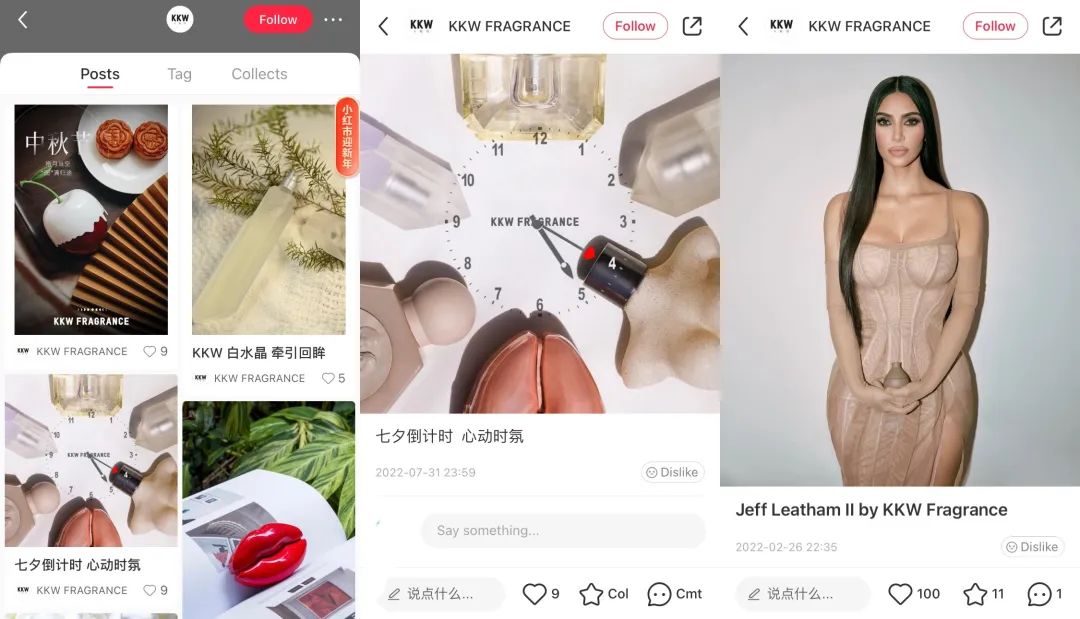 卡戴珊创办的KKW Fragrance目前入驻了微博和小红书两个社交平台,主要在平台中发布产品图片、销售信息、“海外同款”的品牌/明星宣传视频,所配的文案比较平淡。同时,品牌的社交媒体更新频率很低,2022年其小红书一共只发布了17篇内容。此外,品牌的运营主要以图文和视频为主,不会借助直播等新形式来加强消费者互动。整体来看,KKW Fragrance没有进入中国消费者的语境之中,更多的只是在自说自话。