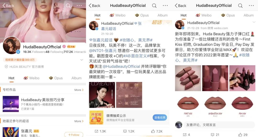 但很少有网红品牌会与中国明星或KOL合作,即便是有合作,对品牌营销所产生的效果也比较微弱。Huda Beauty算是少数请了明星代言的海外网红品牌之一,该品牌2020年进入中国,直到2021年10月才官宣了中国区首位品牌挚友为男团INTO1中的张嘉元。在官宣与张嘉元的合作之后,Huda Beauty随后发布的多条与之相关的微博内容流量暴增。