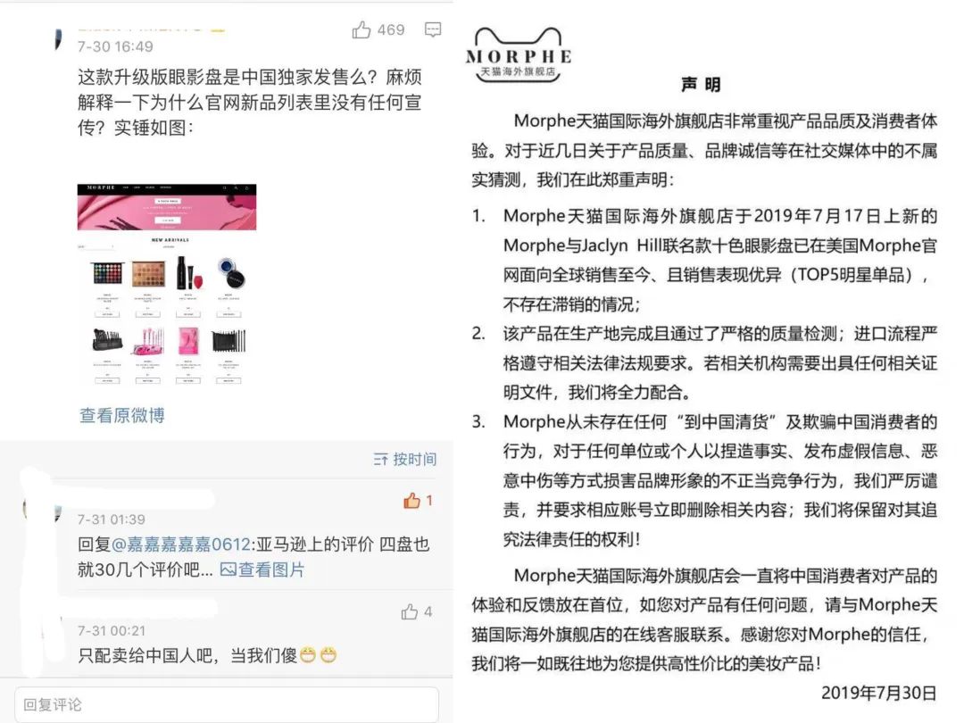 首先,海外网红品牌所提供的产品有时并没有赢得中国消费者的心。2019年时,美国网红美妆Morphe品牌在中国市场借助KOL进行品牌和产品推广。但一款Jaclyn Hill(国外美妆博主)x Morphe十色合作盘却被曝出“在国外属于品控不合格被召回的垃圾产品”。尽管Morphe天猫国际海外旗舰店随后发声明澄清,但消费者并不买账,认为品牌在混淆概念。后来,该品牌店铺消失在天猫国际中。