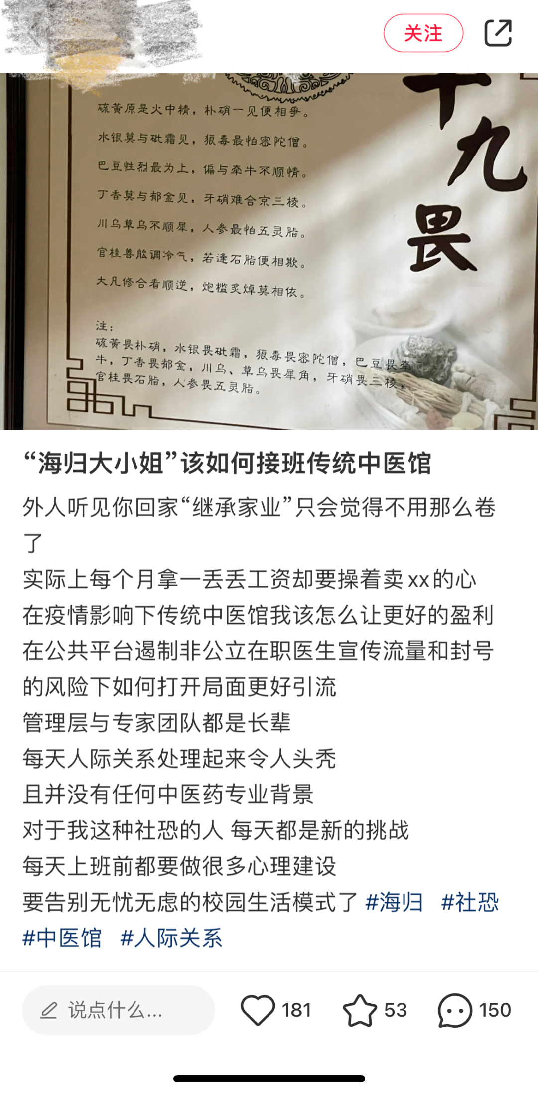 变的不止生活节奏,Iris的社交账号上也随之风格大变:微信朋友圈里如今罗列着密密麻麻的关于中医馆的“广告”,而在一年前还全是阳光和沙滩;小红书上,曾经晒的是海外的“旅游日记”,但在一个多月前,一条《“海归大小姐”该如何接班传统中医馆》的笔记,让她受到前所未有的关注。