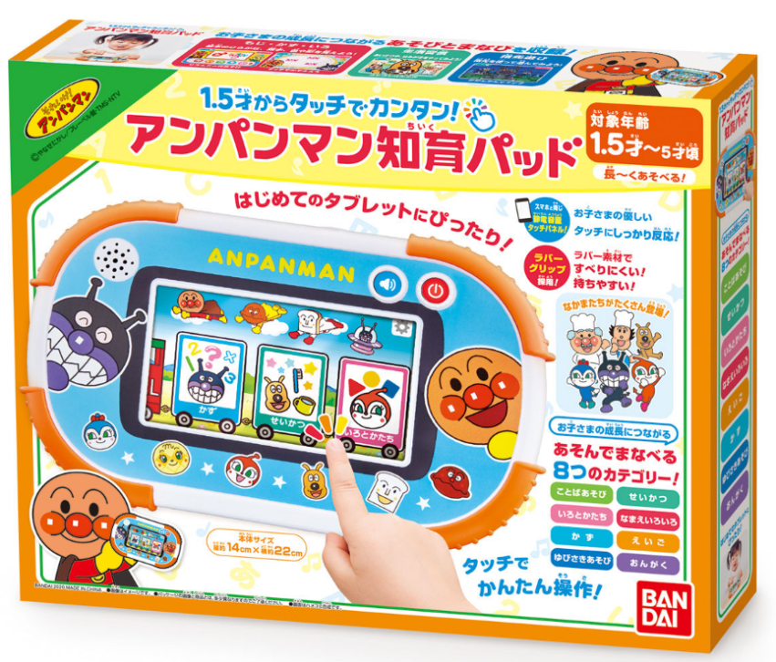 这款智能平板以1.5岁至5岁幼儿为对象,搭载面包超人角色智育游戏,搭配声音、画面教语言、生活、数学、英语、音乐等等启蒙知识,触屏操作简单。放入电池后,简单触碰一下便可启动,小孩一个人也可以启动。同时带有定时功能,可防沉迷。