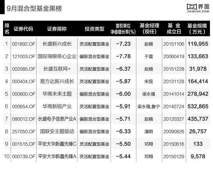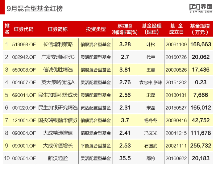 根据Wind数据统计,截止至9月底,全市场共有1993只混合型基金,9月平均收益率-0.51%。下面分别为混合型基金综合得分前十名和后十名榜单: