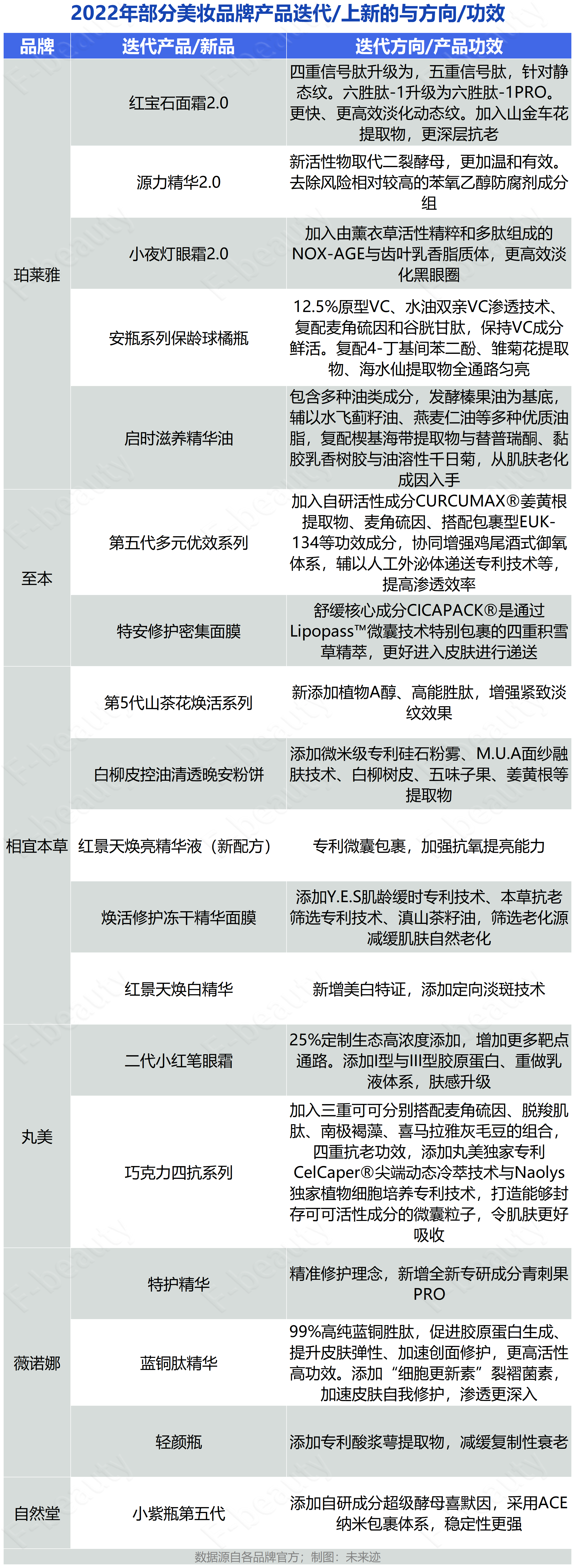 根据《未来迹Future Beauty》不完全整理发现,2022年有多个品牌对旗下产品进行了升级或上新,珀莱雅接连升级“红宝石面霜”、“源力精华”、“小夜灯眼霜”三款王牌产品。至本、相宜本草也接连发布第五代多元优效系列及山茶花焕活系列产品。