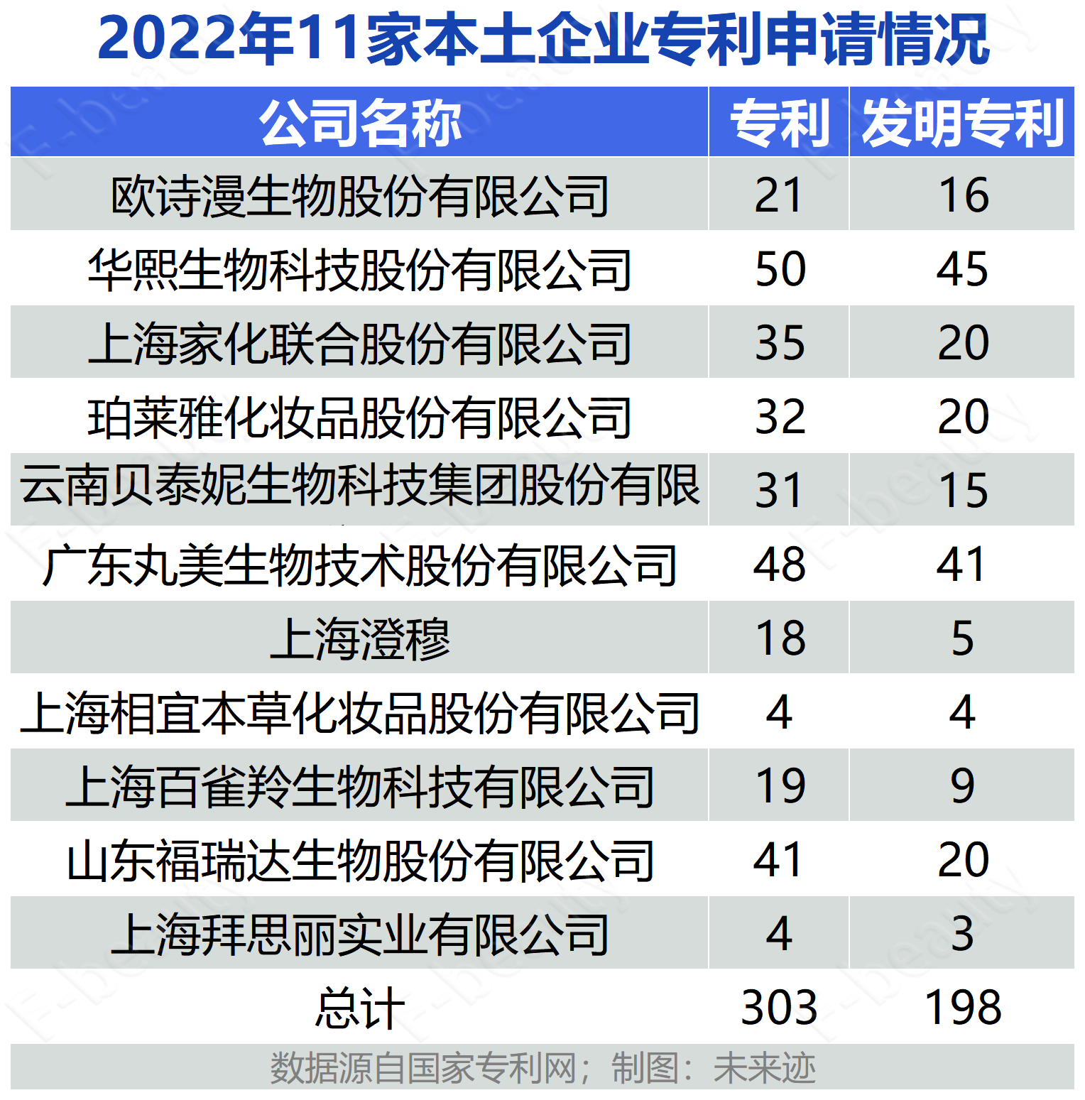 《未来迹Future Beauty》梳理发现,2022年11家本土化妆品企业一共申请了303条专利,其中发明专利198条,占比64.35%,相比2021年同比增长了接近8个百分点。