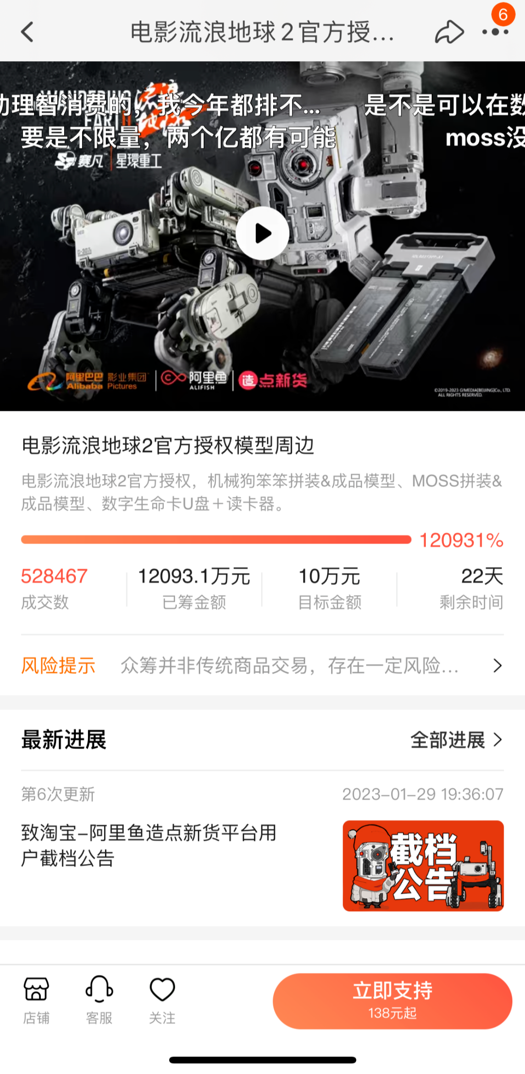 燃次元发现,截至1月31日晚7时,电影《流浪地球2》在“阿里鱼—造点新货”上的产品众筹已大比例超额完成。其中,官方授权模型周边的众筹金额已超1.2亿元(人民币,以下未标注则同),超出目标金额10万元的1200倍。另外两款周边“笨笨”和徐工集团官方联名模型,在众筹平台上的已筹金额也分别达到了570万元和42万元,均超目标金额数十倍。