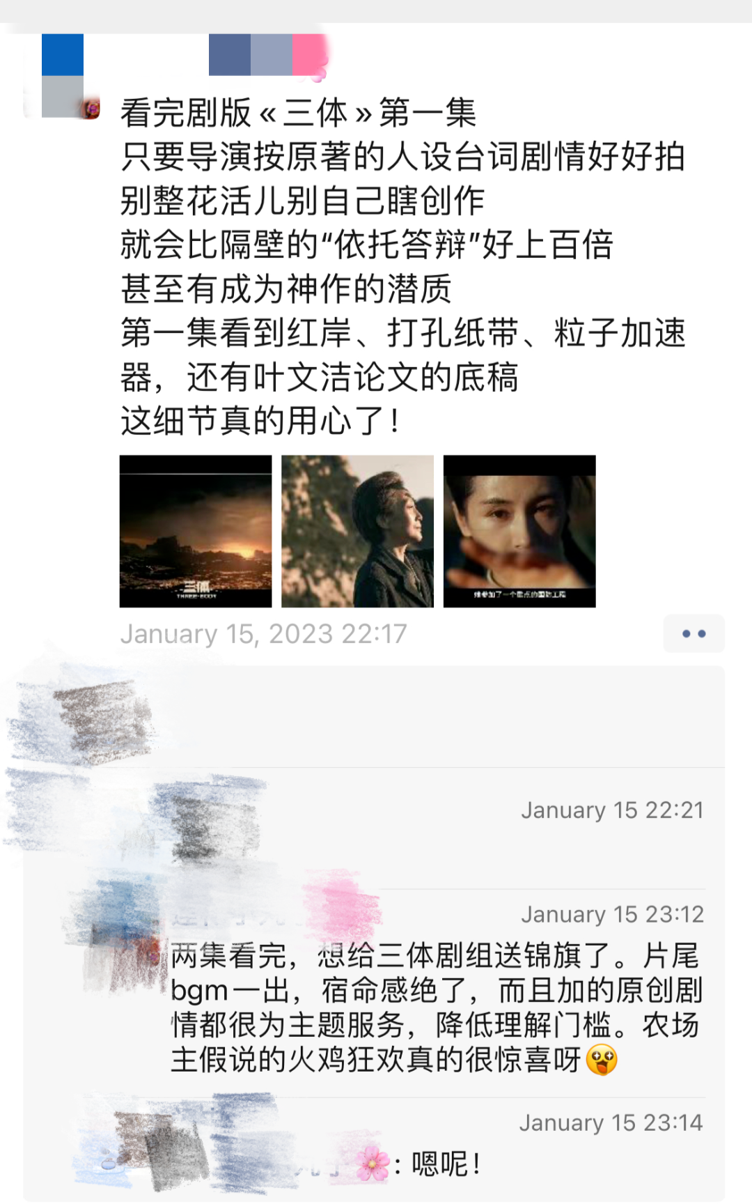 “两集看完,想给《三体》剧组送锦旗了。片尾背景音乐一出,宿命感绝了!”《三体》书粉安琪在仅仅看了剧集的开头后,就立马发朋友圈如此评论。