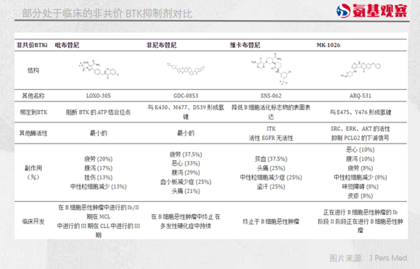 这为第二代BTK抑制剂创造了逆袭的机会。第二代BTK抑制剂提高了选择性,减轻了药物的脱靶效应,因而药物的不良反应比第一代BTK抑制剂更小。