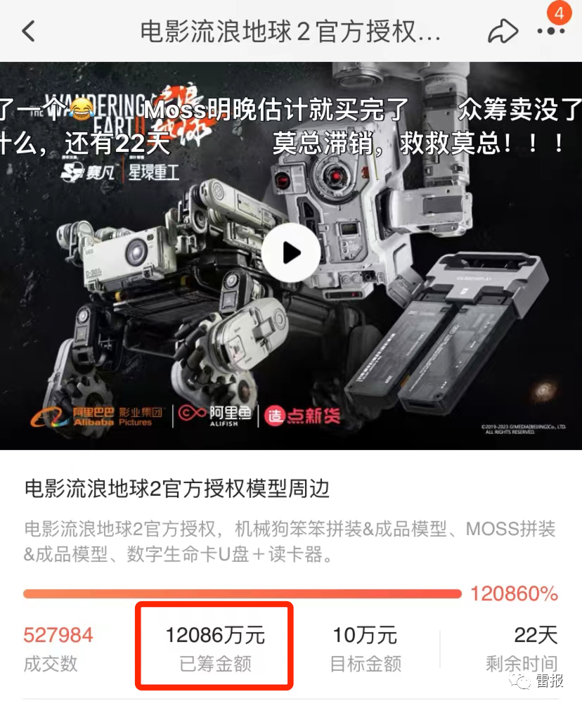 备受大家关注的,在造点新货上进行的“电影《流浪地球2》官方授权模型周边”众筹项目目前的众筹金额已经过亿,用时不到9天。而如果将《流浪地球2》的其他周边产品的销售金额纳入进来,这一IP主体的衍生品销售额其实在更早的时间就突破了“亿元”的范畴。