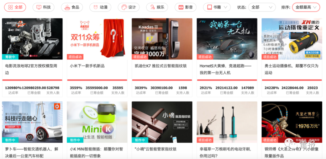 此外还统计了B站,因为B站会员购的众筹栏目不能直接按金额进行排序,因此主要根据“销量优先”,再对应金额进行项目统计。在这些过百万的被统计项目中,国产科幻动画《灵笼》表现优异,收获超1665万的众筹金额,此外,未被统计项目中,还有dodowo推出的蔬菜精灵系列盲盒曾在B站众筹到近1400万元,用时28天。其余统计到的项目,众筹金额也大多在一两百万左右,超500万的项目有2个。