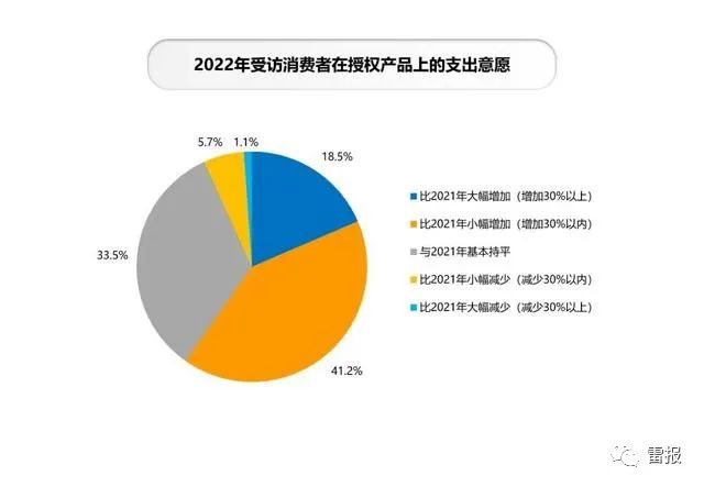 中国玩协编写的《2022中国品牌授权行业发展白皮书》则显示,2021年中国年度授权商品零售额为1374亿元,同比增长24.2%。同时报告中59.7%的受访消费者表示,2022年的消费意愿是比2021年在授权产品上支出更多金额,受访消费者在增加授权产品的支出意愿方面呈整体上升趋势。