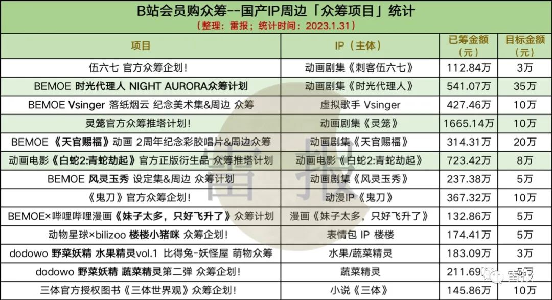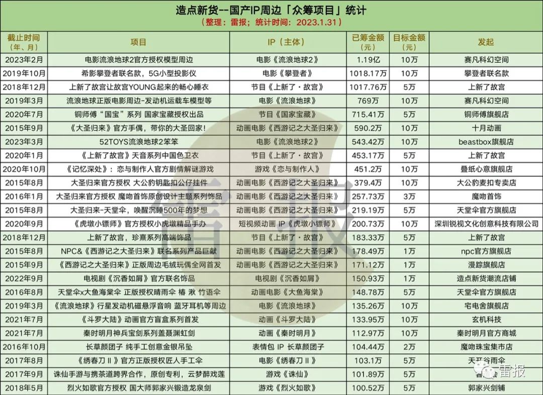 作为对比,撰文时《流浪地球2》的累计票房为27.27亿,片方分账9.85亿,同一时间与之对应的上面提到的众筹项目筹集金额为11848.2万元,经计算仅该单个周边众筹项目筹集资金就占到片方分账金额的12%,同时IP产品的销售金额还在持续增长。那么,这些“成绩”在行业内到底是什么水平?又或者有着什么样的意义?