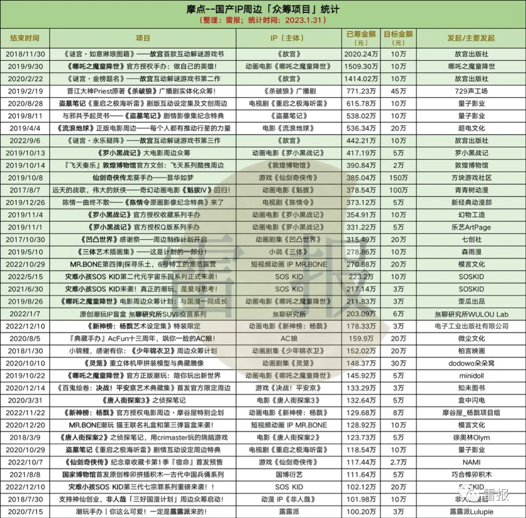 首先,“流浪地球”是国产IP,本文也针对国产IP展开统计;另外,因关于IP整体的衍生品的销售情况较难统计,因此本文也借此契机主要从“众筹”出发,来一窥“流浪地球2周边”在行业领域中的地位,以及目前国产IP周边的开发、销售情况。(注:筛选的是所统计的3个平台上众筹金额过百万的众筹项目)