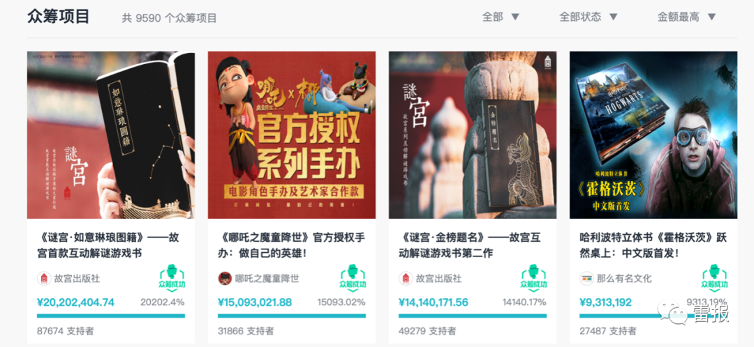 总体来看,截至目前,过百万项目中,该平台近9成的国产IP周边众筹项目的已筹金额在“百万级别”,这其中又有超过一半的项目筹集金额在100~200万范畴;千万级别仅2个,同时在1000万上下,和《流浪地球2》的过亿众筹项目相比,二三名还未达到后者所筹金额的“千万位”,也就是整整多出一个多亿。