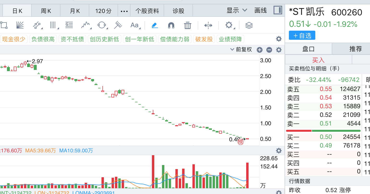 相比*ST吉艾(300309.SZ)在股价滑落到1元以下,尚有东方财富证券的拉萨游资团入局拉升,如今只剩几毛钱的*ST凯乐(600260.SH)可以说是回天乏术了。