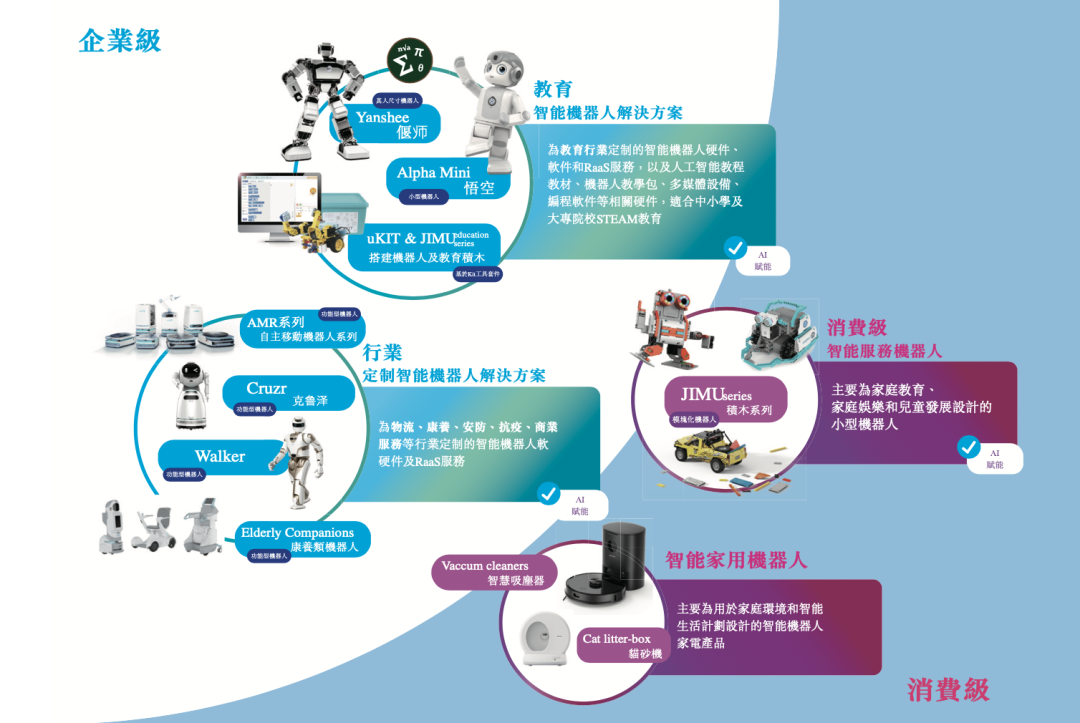 除企业用户外,优必选科技的机器人产品,还包括面向消费者的非教育类人形机器人、积木(JIMU)机器人以及智能清洁机器人。