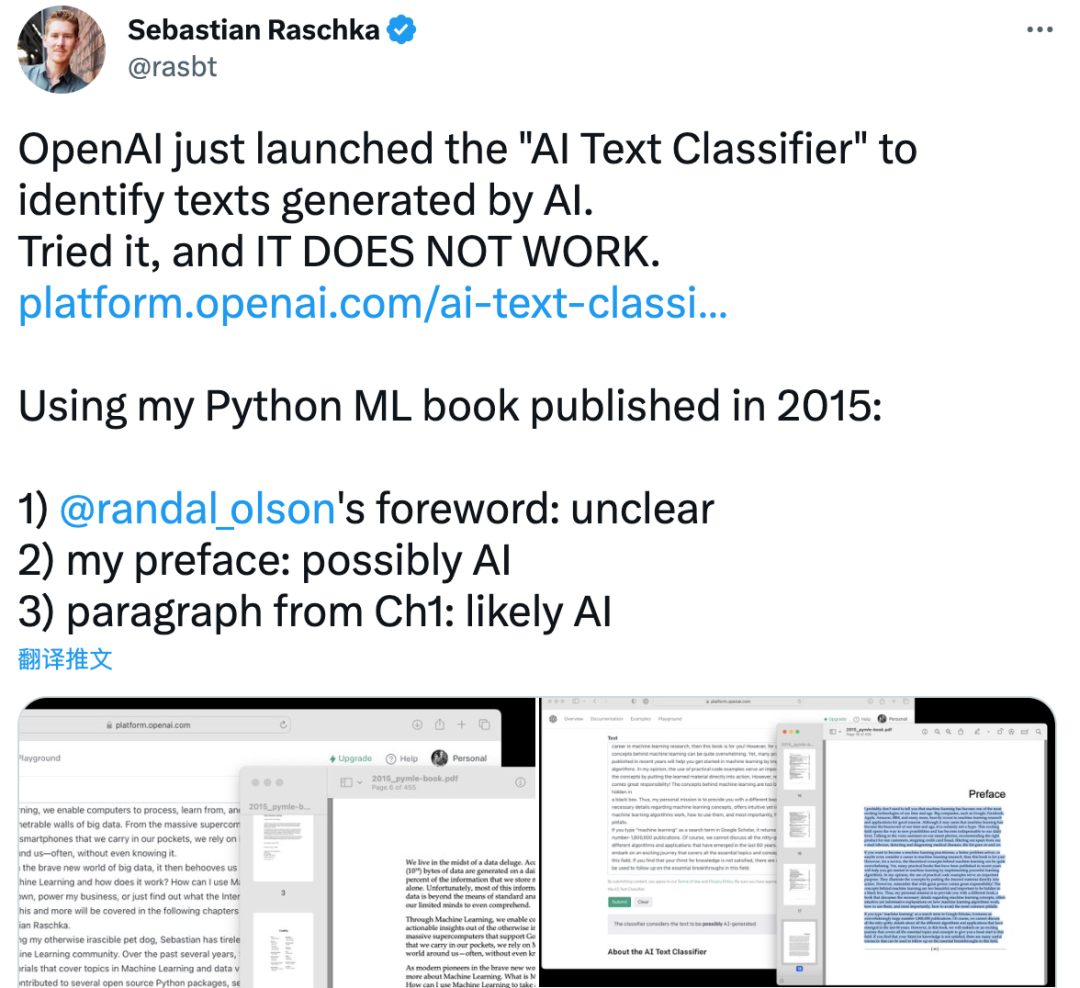 Sebastian Raschka还从自己在2015年出版的Python ML书摘录了好几段,AI文本分类器的识别也不是很准,Randy Olson的前言部分被识别成“不清楚是否由AI生成”,他自己写的前言部分被识别成“可能是AI生成的”,第一章部分被识别成“很可能是AI生成的”。