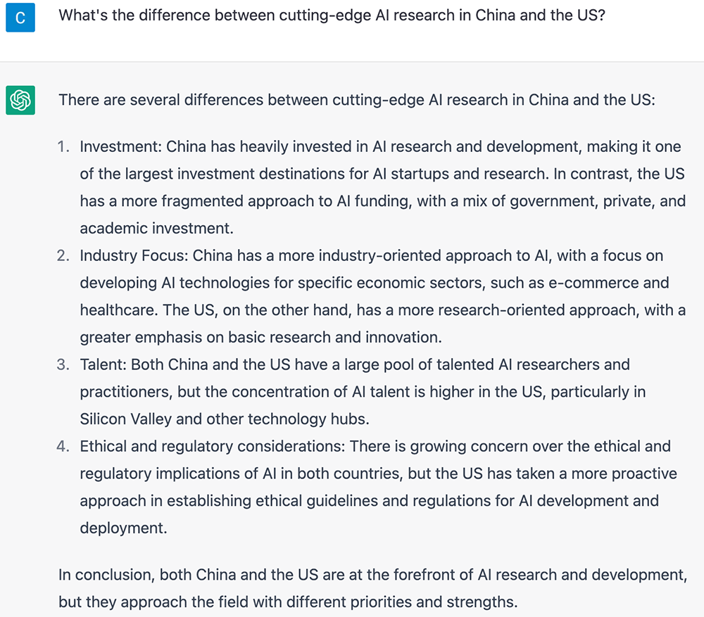 ▲ChatGPT针对“中美前沿AI研究有哪些不同”问题的回答