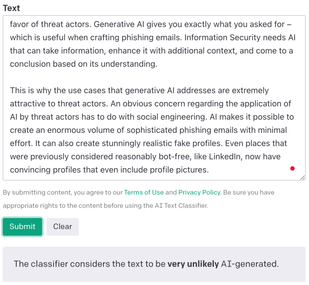 AI书写的文本可以通过编辑来逃开分类器的检测。OpenAI分类器可根据成功的攻击进行更新和重新训练,但还不清楚从长期来看检测是否具有优势。