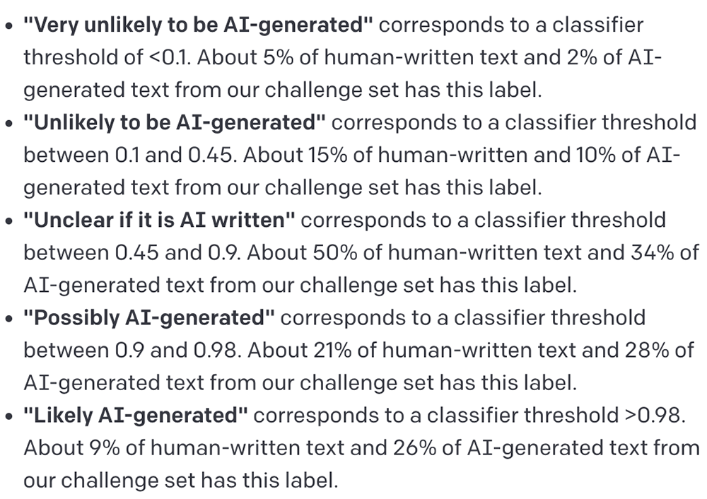 在对英语文本“挑战集”的评估中,该分类器正确地将26%的AI创作文本识别为“可能是AI编写的”,而在9%的时间内错误地将人类创作文本标记为AI编写。