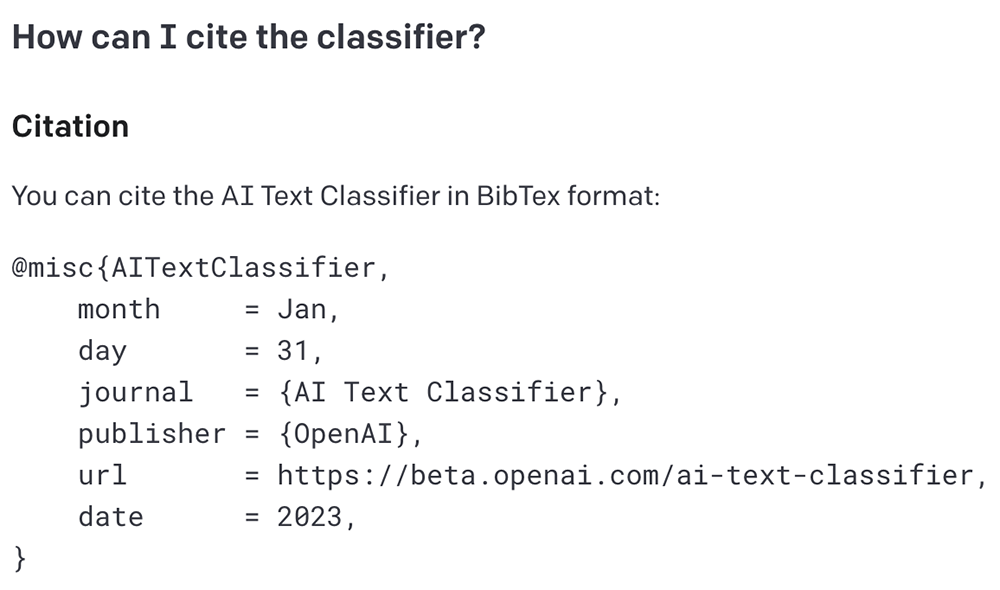OpenAI也贴心地为试用者备好了引用这款AI文本分类器的BibTex格式。