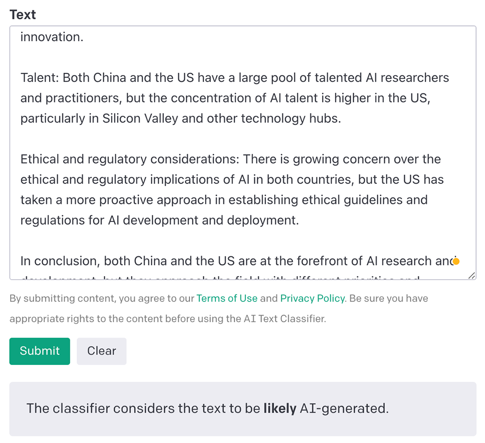 这款AI工具可免费试用。用户将待检测文本复制到文本框中,点击Submit,系统就会评估该文本由AI系统生成的可能性,给出评估结果。