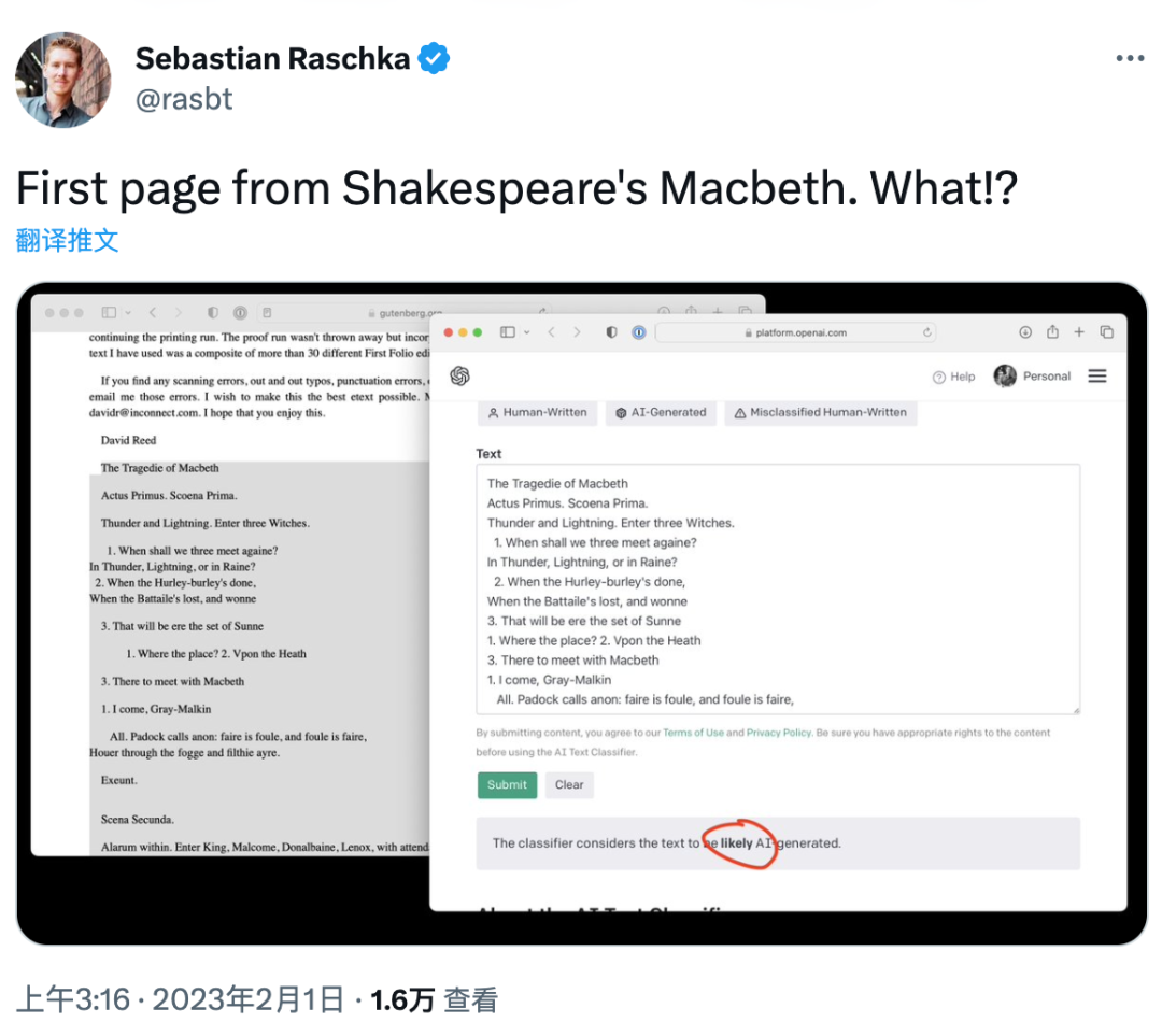 知名AI研究人员Sebastian Raschka用莎士比亚《麦克白》第一页的内容做测试,发现AI文本分类器误判为“很可能是AI生成的(likely AI-generated)”。