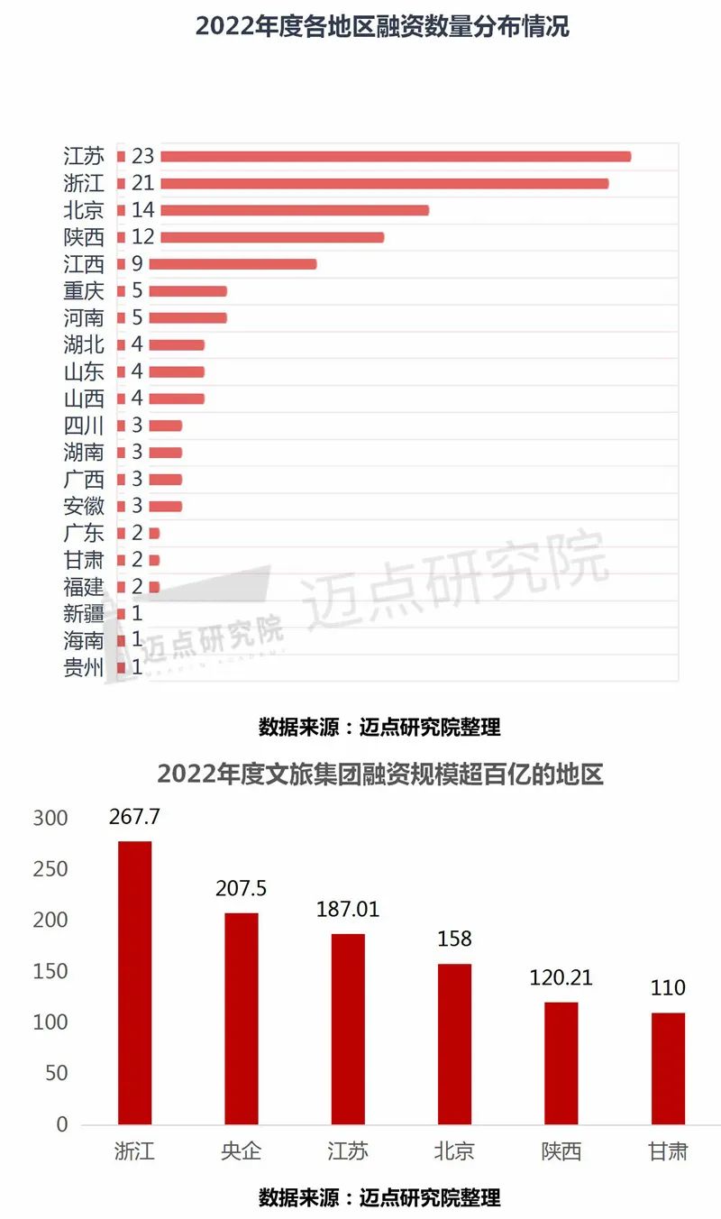 从各地区的文旅集团融资情况看,江苏省的文旅集团融资频次最高,一共23项,涉及14个文旅集团,融资金额187亿元;其次是浙江省,融资21项,涉及12个文旅集团,融资金额267.7亿元;北京市以首旅集团为主导,发生融资14项,融资金额158亿。作为文旅大省的陕西省表现亦佳,融资金额120亿元。