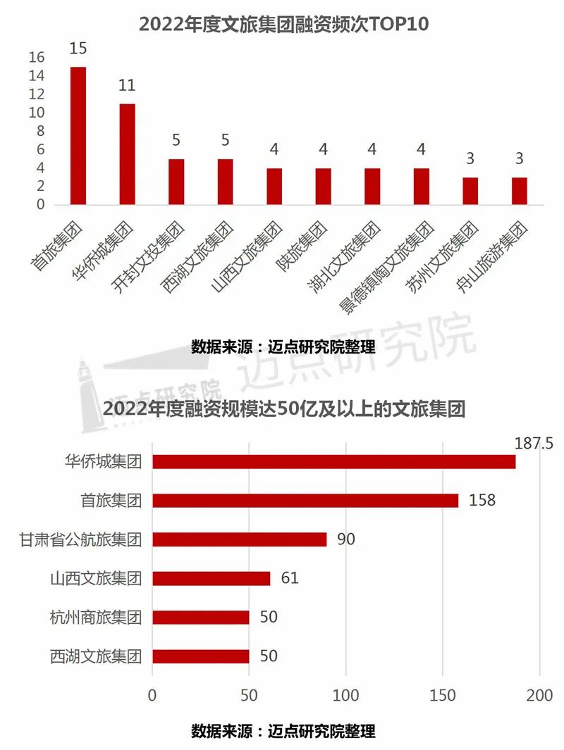 从单个文旅集团维度看,2022年融资活跃的集团企业以首旅集团、开封文投集团、杭州西湖文旅集团、华侨城集团等为代表,侧面反映了疫情影响下这些集团公司的现金流承压,资本运作频繁一方面获取短期资金补充现金流,另一方面获取中长期资金进行产品开发和项目建设;从集团融资规模看,融资额超百亿的有华侨城集团和首旅集团2家,分别为187.5亿元、158亿元;50亿~100亿区间的包括西湖文旅集团(50亿元)、杭州商旅集团(50亿元)、山西文旅集团(61亿元)、甘肃省公航旅集团(90亿元)共4家。