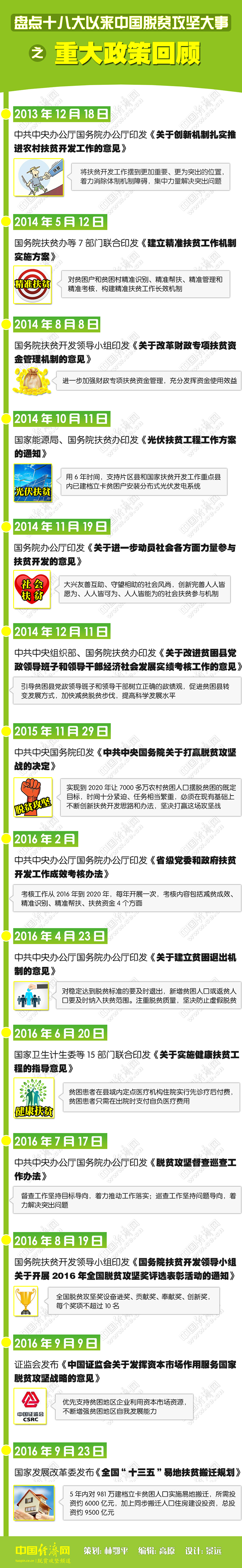 今年是“十三五”开局之年,习近平总书记发出了打赢脱贫攻坚战的总攻令,从中央到地方扶贫日活动的筹备工作正紧锣密鼓,扶贫日的舆论氛围也日渐浓厚。中国经济网策划制作系列图解“盘点十八大以来中国脱贫攻坚大事”。今日推出《盘点十八大以来中国脱贫攻坚大事之重大政策回顾》。