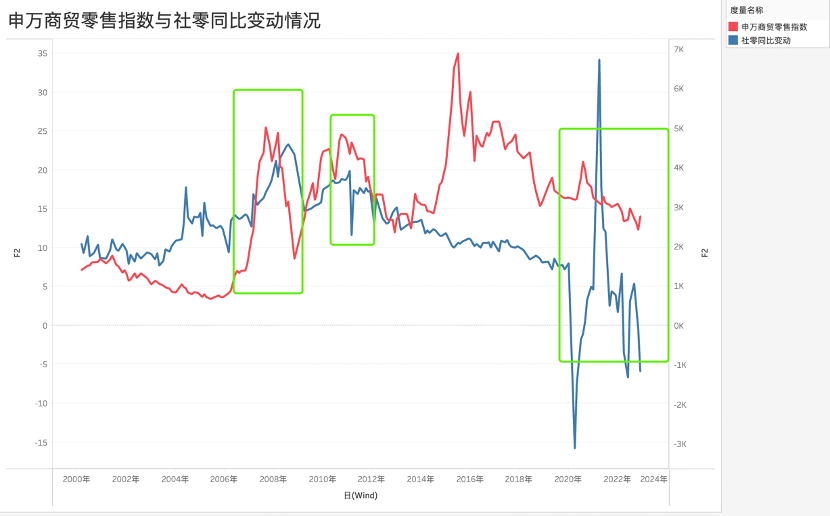 虽然市场在短期内并不一定完全是基本面的投射,但如果熨平周期,拉长时间去看,资本市场的表现往往是基本面的前置指标。在上图中我们可以非常明显看到,申万商贸零售指标是要领先于社零变动(大概1-2个季度),在微宏观分析师对未来预期进行详细分析之后,市场会提前兑现价格。
