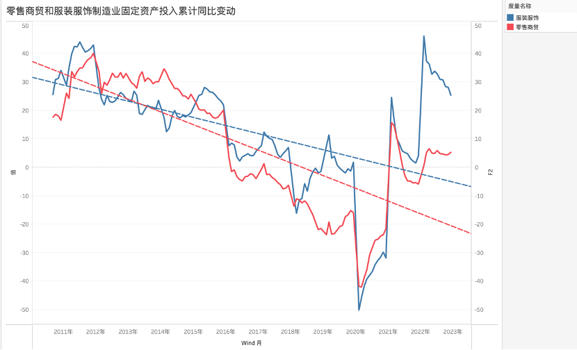 在过去十年内,尽管困难重重但中国宏观经济还是交出了良好的成绩单,但在上图中我们却看到了微观层面的起伏波动。简单来说,无论是出于边际效益递减抑或此前的供给侧改革影响,都直接反馈在内需层面投资的递减,尤其市场化非常充分的服装行业,其固投总趋势一致在下行(2020-2022三年平均增长几乎为0),另一方面由于线上零售交易和物流便捷性的提高,线下商贸零售企业可谓节节败退,固定资产投入亦非常保守。