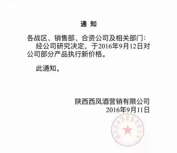 近日,微酒记者获取一份来自陕西西凤酒营销有限公司在9月11日下发的通知。通知指出,各站区、销售部、合资公司及相关部门:经公司研究决定,于2016年9月12日,对公司部分产品执行新价格。