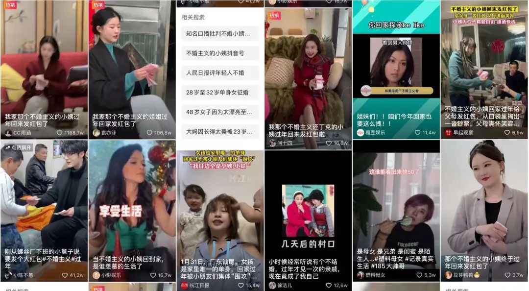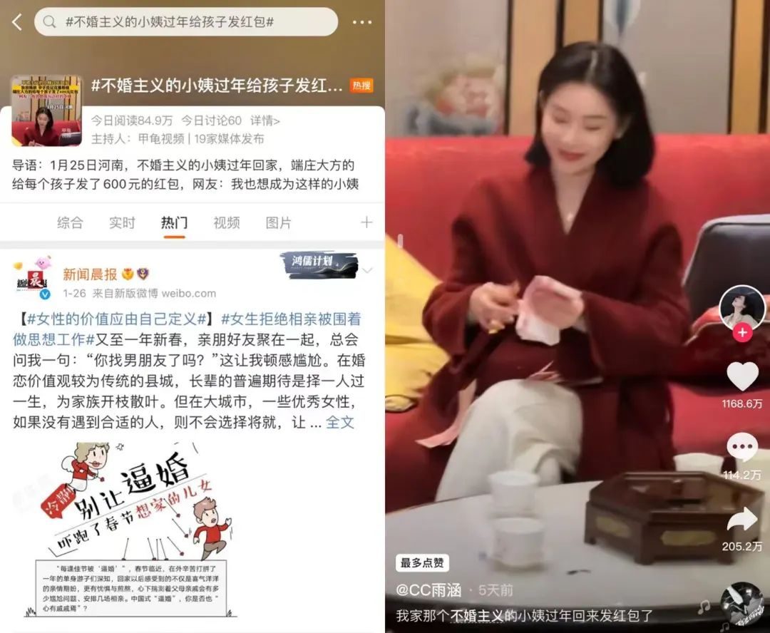 不久前,“不婚主义的小姨过年给孩子发红包”登上了微博热搜,该条视频最早正发布于抖音,目前在抖音点赞数超1000万,而在微博相关话题下,称赞“不婚”让这位小姨显得年轻,是评论区的主旋律之一。