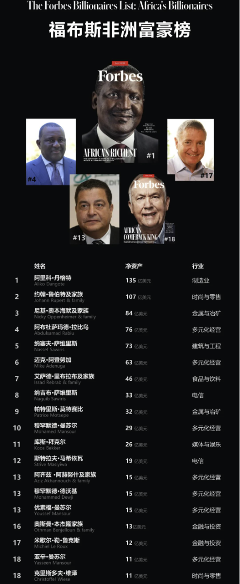 2月1日,福布斯通过官微发布2023非洲富豪榜。榜单显示,在非洲的54个国家中,只有7个国家有亿万富豪上榜。尼日利亚实业家阿里科·丹格特(Aliko Dangote)的财富下降了4亿美元,至135亿美元,连续第12年蝉联非洲首富。南非奢侈品巨头约翰·鲁伯特(Johann Rupert)则连续第二年位居第二,尽管他的身家下降了3亿美元,至107亿美元。2018年因会计丑闻退出榜单的南非人克里斯多夫·维泽(Christoffel Wiese)在成功起诉零售商施泰因霍夫国际(Steinhoff International)后重返榜单。