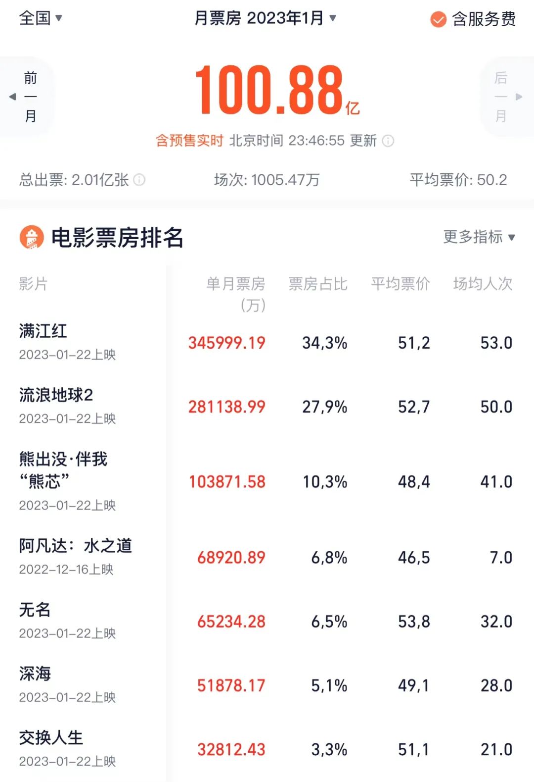 一月的月度票房超过了100亿,这在史上单月票房榜上排名第五,仅次于此前四次春节档所在的二月,是一月的历史最高票房。