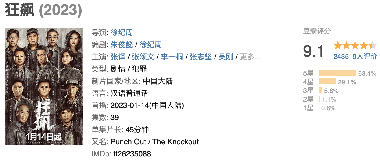与热度一同飙升的还有口碑。《狂飙》豆瓣开分高达8.7,截至发稿前评分已经升至9.1,有超过23万的网友为该剧评分——整个2022年,也只有一部《大山的女儿》解锁国产剧豆瓣9分成就。